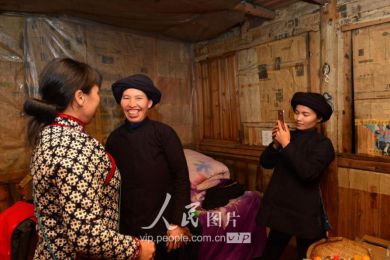 一般要到快過春節(jié)的時(shí)候,男方家才專門請人去接女方來洗糯米、打糍粑,新娘方能在夫家住上一夜;在來年農(nóng)忙時(shí)節(jié),又接女方來幫忙,夜里仍不能在男方家留宿,幫完忙當(dāng)晚即回去,只有待到女方有身孕后,新娘才到夫家長住。圖為11月16日夜,新娘潘芝銀家為準(zhǔn)備婚禮,燈火徹夜長明。
