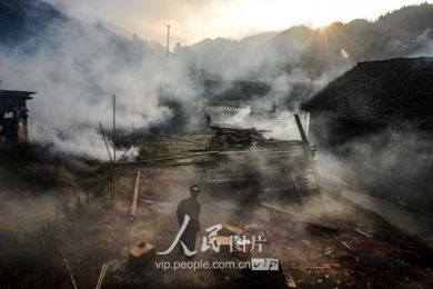 一般要到快過春節(jié)的時候,男方家才專門請人去接女方來洗糯米、打糍粑,新娘方能在夫家住上一夜;在來年農(nóng)忙時節(jié),又接女方來幫忙,夜里仍不能在男方家留宿,幫完忙當(dāng)晚即回去,只有待到女方有身孕后,新娘才到夫家長住。圖為11月16日夜,新娘潘芝銀家為準(zhǔn)備婚禮,燈火徹夜長明。