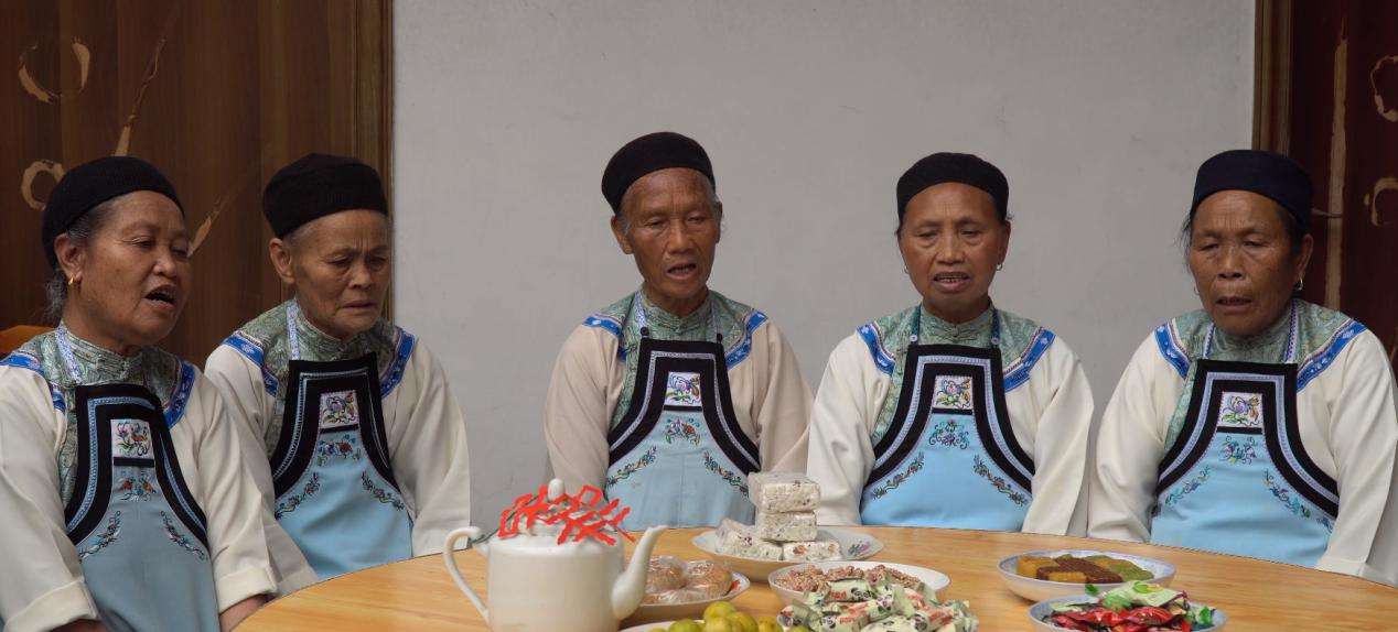紅星村村內(nèi)布依族村民保留有布依族傳統(tǒng)服飾,在日常生活中也還有穿著布依族服飾的習(xí)慣。紅星村布依族女性服飾做工精細(xì),款式多樣。老人頭戴黑色圓帽,上身主要穿著灰白色斜襟上衣和青藍(lán)色打底的圍腰,上衣領(lǐng)口至兩肩處繡有大面積花紋圖案,圍腰上部也繡有花紋圖案作為裝飾。圍腰上的兩條絲帶系于身后,絲帶上繡有花紋圖案。下身穿著灰色長(zhǎng)褲。