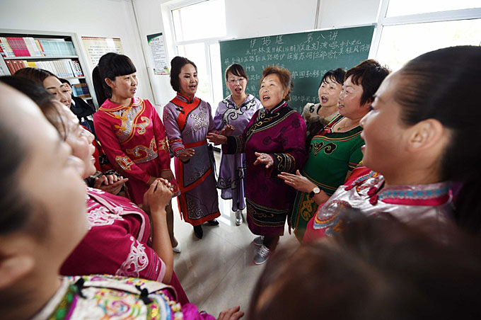 “伊瑪堪”傳承人吳桂鳳(右四)在同江市八岔赫哲族“伊瑪堪”傳習(xí)所教授“伊瑪堪”(新華社記者王建威 攝影)