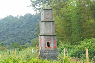 這座完整的“惜字爐”位于易家田村巫水河西岸田垅邊,座北朝南,塔下河水潺潺,古木參天,景色宜人。全爐六角六面形,三層式格局,分為底層、亭座、亭身、云蓋、亭頂五部分。其中基礎(chǔ)層高105cm,主體第一層至第三層高度分別為120cm、105cm、88cm,頂層高70cm,連同3個云蓋在內(nèi)總高度達6米?!跋ё譅t”呈六面形,基礎(chǔ)層為正方形,四面各寬140cm;主體第一層至第三層每面寬度分別為70cm、60cm、50cm。頂層為3個寶葫蘆。