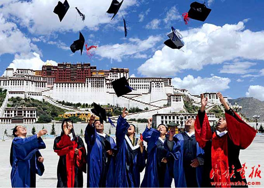 西藏已有普通本??茖W(xué)校7所。西藏大學(xué)一批被授予博士、碩士學(xué)位的學(xué)生在布達(dá)拉宮廣場(chǎng)慶祝畢業(yè)