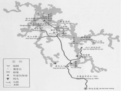 此外,值得一提的新景觀工程還包括對(duì)神山的改造與裝飾。位于祭祀廣場(chǎng)的北頭的山,是村落附近乃至普者黑地區(qū)最高的一座山,半山有一個(gè)天然溶洞就是著名的仙人洞。洞里主要由一個(gè)高20余米面積近100百平方米大穹廬和深淺不一的小洞穴組成,四壁是石鐘乳。進(jìn)入洞內(nèi),看見平時(shí)人們祭祀時(shí)遺留的陶瓷油燈、香爐、香燭、紅布、各色紙?jiān)`物等。據(jù)村民說(shuō),這洞是附近村落居民經(jīng)常前來(lái)祭祀求子的地方。筆者在洞口不遠(yuǎn)處看到用紅漆在石壁上書寫的署名為仙人洞村民委員會(huì)的“安民告示”,[ 安民告示內(nèi)容是:“仙人硐石林美景,不準(zhǔn)任何人破壞,違者罰款拾元”,落款時(shí)間為1987年。]據(jù)村委會(huì)黃先生介紹,目的是為了使該洞的石鐘乳得到保護(hù)并保持該洞作為村民信仰場(chǎng)所的純粹性。然而,2006年春節(jié),筆者在仙人洞洞口左右兩側(cè)所看到的是用青黑色顏料繪制有據(jù)說(shuō)是守護(hù)神的一男一女以及類似飛天的新巖畫,為筆者向?qū)У碾S行村民說(shuō),是文化生態(tài)村項(xiàng)目組專家畫的。這樣的“創(chuàng)新景觀”巖畫,筆者后來(lái)在該村密枝山上還看到幾處,均出自項(xiàng)目專家的“生產(chǎn)”。原本視為神圣之地,禁止人畜進(jìn)入和隨意攀爬的密枝山,自成為生態(tài)文化村后,為旅游發(fā)展需要,已經(jīng)修建了經(jīng)由歌舞坪通往山頂?shù)氖?jí)道路,登上山頂能將普者黑景區(qū)和仙人洞村一覽無(wú)余。