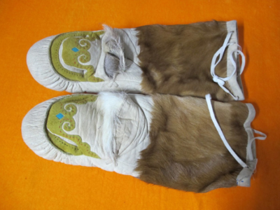 此外鄂倫春人還有被稱為“瓦拉開依”的手套,它和北方人做的棉手悶子一樣,是拇指同其他四指分開的手套,手心處無開口,戴這種手套可以保暖,也可以拿比較笨重粗大的東西,但不能射獵。另一種被稱為“沙拉耶開依”,是五指手套,即五指分開,戴這種手套拿東西或射擊都很方便,但保暖性能差,多為青年人喜愛和佩戴。鄂倫春人冬季出獵,一般還是喜歡戴“考胡魯”。以上三種手套多用狍皮制作,五指分開的手套也有用鹿皮制作的。