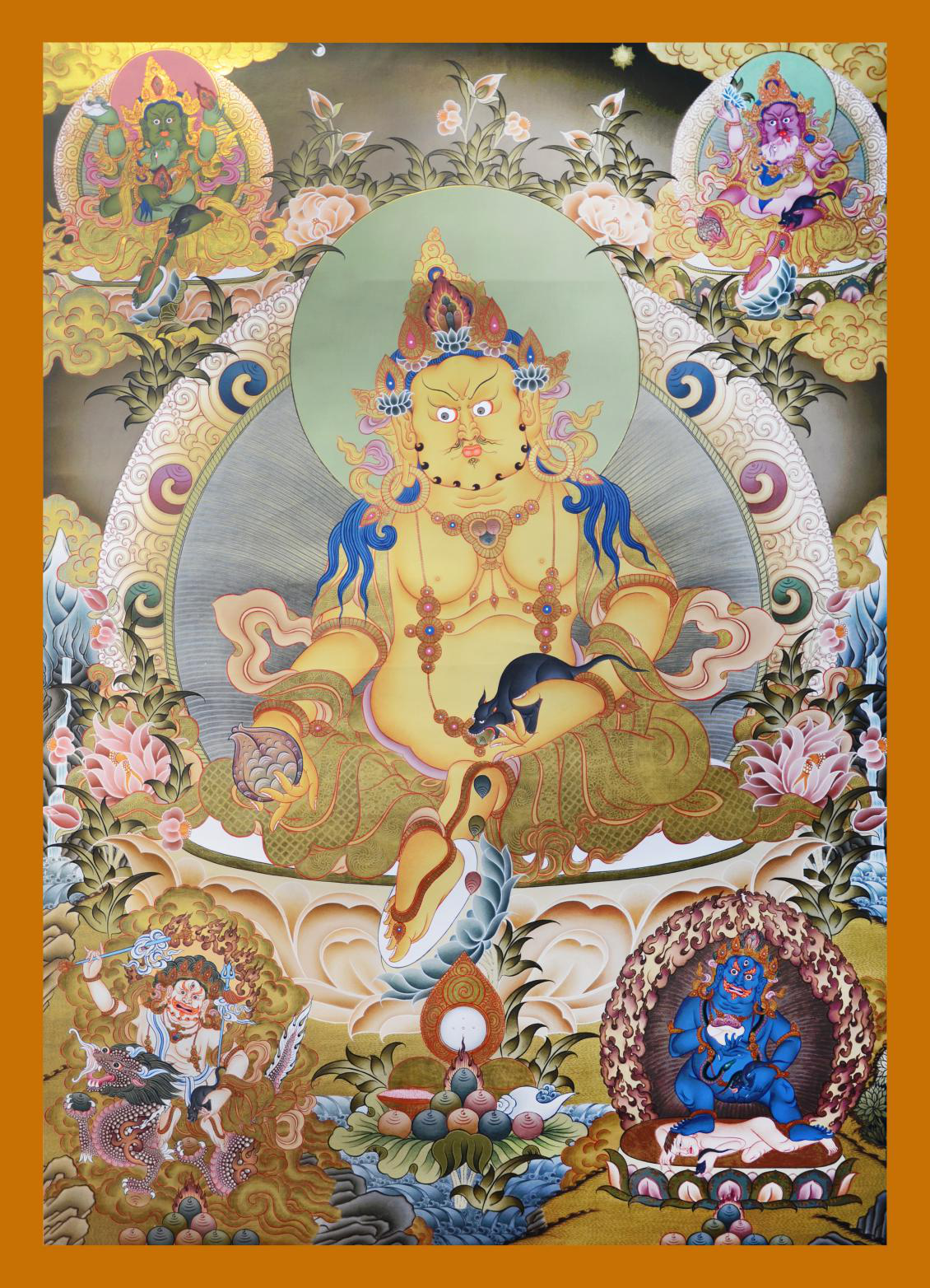 這個唐卡上面是五路財神。左上角是綠財神,右上角是紅財神。左下角是黑財神,右上角是白財神。