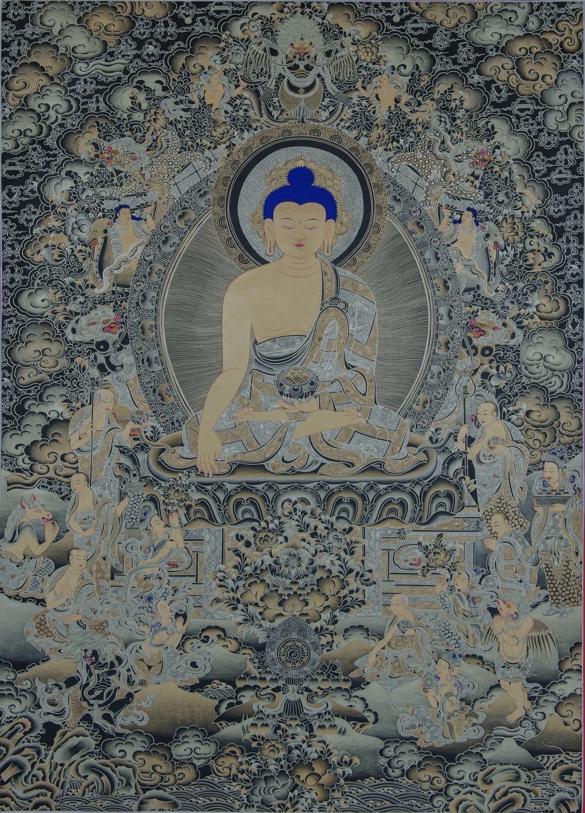 此唐卡是夏吾尖措畫家通過(guò)幾個(gè)月的辛勤勞作制成的又一大師級(jí)巨作。其制作工藝、顏料調(diào)配法都是夏吾家族幾代畫家傳承下來(lái)的絕世密法。原料也都是由祖先留下來(lái)的黃金用傳統(tǒng)秘方磨成水粉之后畫家用調(diào)好的黃金粉進(jìn)行畫布上勾勒主尊釋迦牟尼佛祖,四周供奉為佛祖五大比丘,僑陳如、馬勝、婆沙波、大名、和跋提聽(tīng)法灌頂。左右供奉為兩大梵天菩薩、國(guó)王、大上師等在傳授佛祖的初轉(zhuǎn)法輪場(chǎng)景,大護(hù)法在蓮花寶座下庇護(hù)惡魔降妖,背景用花鳥、山水、祥云等線條來(lái)襯托整個(gè)畫面的層次與審美。