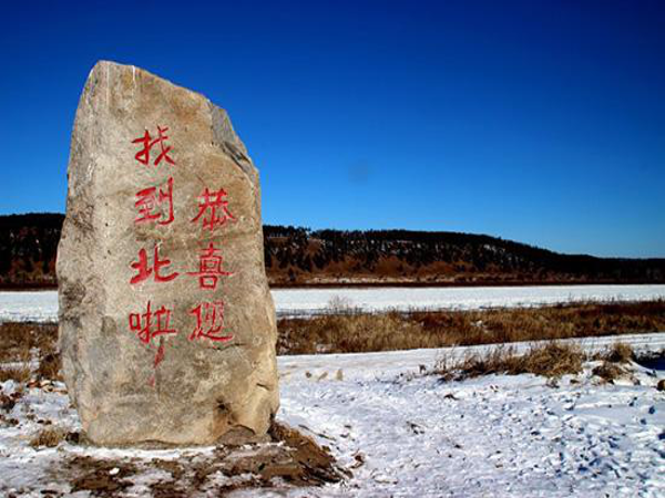 沿著形態(tài)各異的“北”字,可以走到中國最北端的廣場——北望埡口。“東經(jīng)122°20'43。48〃E北緯53°29'52。28〃N”的標志就立在這里,旁邊一塊巨石上刻著“中國北極點”。