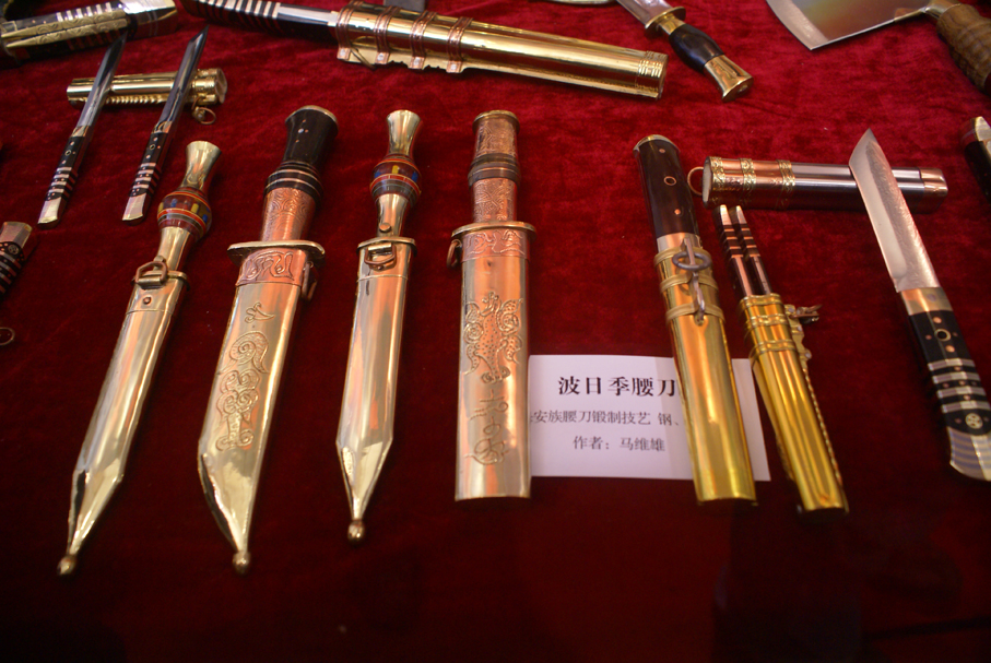 保安腰刀,是保安族的傳統(tǒng)工藝品,由于其打造技藝精悍,與新疆的英吉沙小刀、云南阿昌族的戶撒刀并稱為“中國少數(shù)民族三大名刀”,在中外都享有盛譽(yù)。保安腰刀品種繁多,有“什樣錦”、“雅五其”、“雙落”、“滿把”、“扁鞘”、“雙刀”、“細(xì)螺”、“波日季”、“哈薩刀”、“蒙古刀”等,刀面上刻 “七顆星”、“五朵梅”、“一條龍”、“一把手” 等圖案,這些圖案通常為鐵匠代號(hào),即一看刀面團(tuán)就知道是哪位鐵匠所制,而有的圖案則是記載保安鐵匠的遭遇。保安腰刀中,最為漂亮的要數(shù)“什樣錦”,“波日季”則名氣最大。