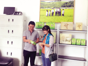 光東村創(chuàng)業(yè)者金君(左)介紹他公司生產(chǎn)的有機大米。