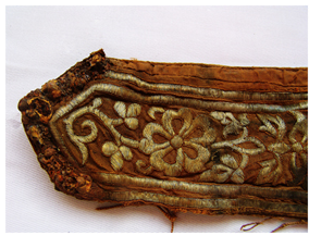中國(guó)民族博物館館藏的臥鹿紋金繡弓囊通長(zhǎng)72CM,最寬處25CM,最窄處6.5CM。面料為絹地,呈深褐色。專家推斷其入土前應(yīng)內(nèi)襯樺樹皮或獸皮類框架。弓囊正面以銀裹金錢繡滿圖案,整體金碧輝煌。由于埋藏地下數(shù)百年,弓囊兩端的鐵質(zhì)穿環(huán)和皮條已銹蝕腐爛。