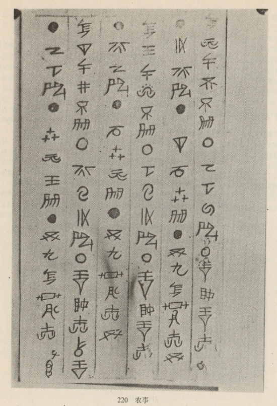 水書抄本。寫于清代,以竹簽作筆書于白皮紙上,共11頁。長26厘米,寬18厘米,從右至左直排。此圖文字乃記述柙棚收獲的時節(jié),其第1行意為:庚午年丁巳日播種,吉。原件現(xiàn)存北京圖書館。