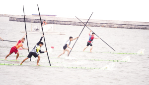 獨竹漂比賽是直道競速項目,運動員站在竹漂上,利用手中的竹竿劃水前進,以抵達終點的先后次序決定名次。本屆獨竹漂比賽分為男子直道競速和女子直道競速兩大項,設(shè)有60米、100米、200米距離的小項,有13支隊伍參加。其中,河南隊為首次參加。