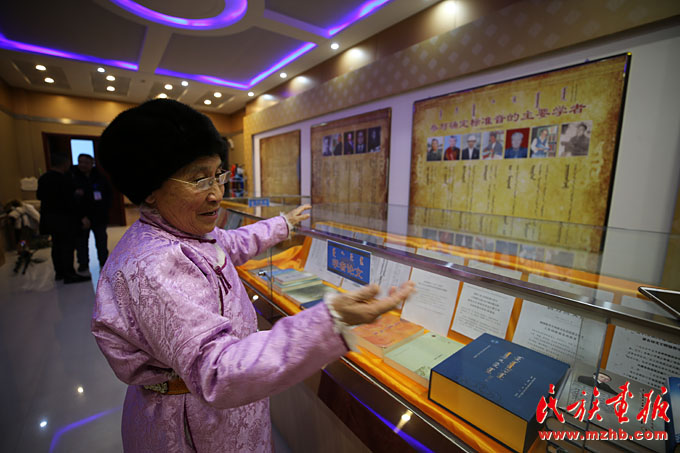 其木格老人向參觀者介紹正藍旗方言被確定為中國蒙古語標準音的歷史