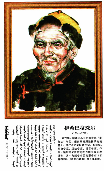 伊希巴拉珠爾(1704~1788),蒙古族,一名也協(xié)班覺、額爾德尼班智達·松巴堪布,蒙古衛(wèi)拉特人,著名蒙醫(yī)學家、文學家、天文學家哲學家。一生著作豐厚,其中對完善蒙醫(yī)理論體系有重要影響的著作有《甘露之泉》、《白露醫(yī)法從新》、《甘露點滴》、《甘露匯集》和《認藥水晶鑒》,在這些著作中他將藏醫(yī)學理論與蒙古人的體質、生活習俗、居住地區(qū)的地理、氣候條件等具體實際結合在一起,進行創(chuàng)造性的理論研究,不僅豐富了臨床實踐的內容,而且補充和完善了蒙醫(yī)學的理論體系,他將傳統(tǒng)蒙醫(yī)學“寒熱理論”與《四部醫(yī)典》中關于寒熱病理論的闡述進行有機結合,使之成為近代蒙醫(yī)學病性辯證的總綱,同時,他也闡述了將六基癥作為病因鑒別診斷的核心及其臨床表現(xiàn),使“六基癥”學說從理論到實踐都獲得了比較系統(tǒng)的發(fā)展。占布拉道爾吉是19世紀著名的蒙藥學家,他編著的《蒙藥正典》(又名嗚嗚蒙藥圖鑒)共收載蒙醫(yī)臨床常用藥物879種,按礦物、植物和動物等分為8部24類,附插圖576幅,對每種藥物的產地、形態(tài)、性味、功能、入藥部分、采集加工、炮制方法、主治、用法等都闡述詳盡,并且每一味藥物都標寫了蒙、藏、滿、漢四種文字的藥名,具有很高的參考價值。該書還附有外科術療器具圖解,以及放血穴位、針灸穴位、人體各部分劃分圖解說明等。敏如爾古布拉(1789-1838)編撰了蒙醫(yī)學方劑巨著《方?!罚且徊勘容^系統(tǒng)完整的蒙醫(yī)藥物方劑學經典著作,收載方劑近200種,分為76章,進行詳盡的論述和評點,同時對相關疾病的病因、病機、分類和治法等也做了簡要論述。
