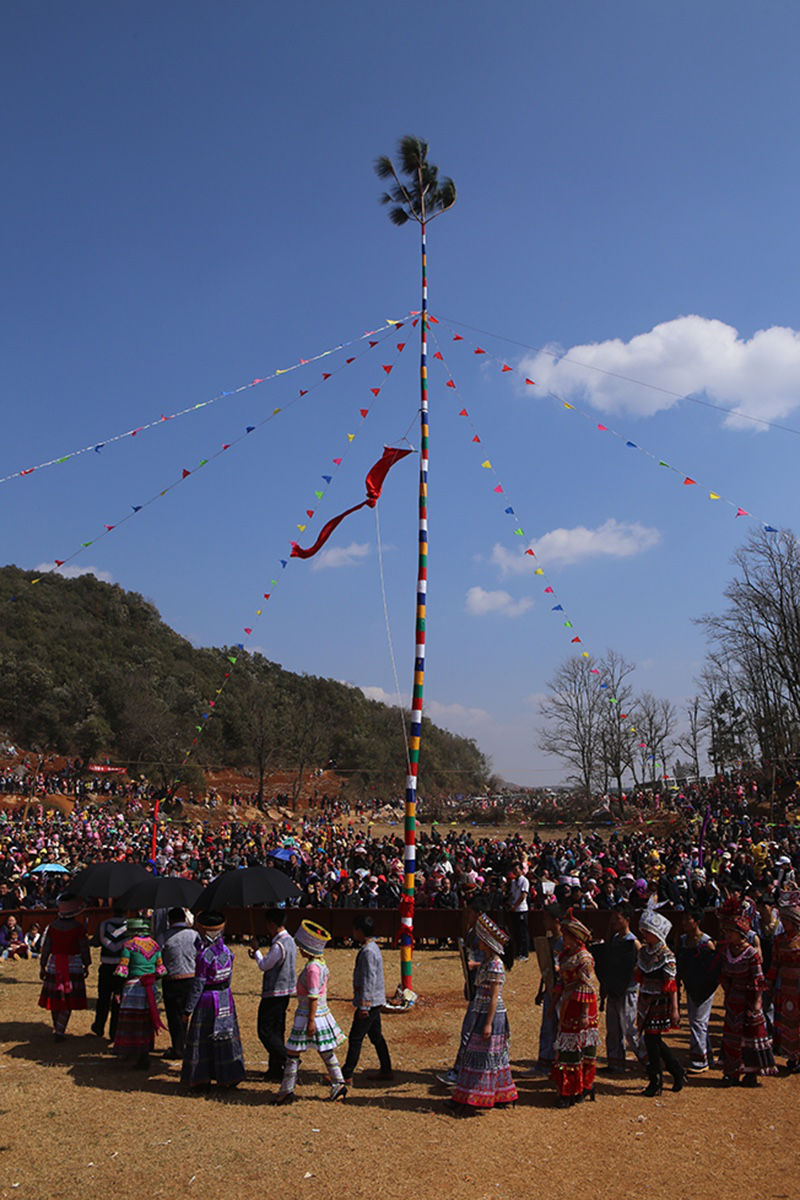 節(jié)日承載著民族的歷史文化和共同記憶?;U祭祖的儀式便是一種活態(tài)的歷史敘事和傳播,分為立桿、祭桿和收桿。立桿是在節(jié)日開始前,選兩棵異體同根、高而直的松樹,一公一母,擇吉日把花桿頭朝著太陽升起的東方豎起來,立在花山場(chǎng)。苗族人認(rèn)為祖先居住的地方是太陽升起的地方。祭桿時(shí)由村中長老和巫師帶頭,圍繞花桿順時(shí)針方向走三圈,同時(shí)獻(xiàn)上祭品,念頌咒語,祈愿祖先保佑。收桿是在節(jié)日結(jié)束時(shí)將花桿頭朝日落的方向放下,人們會(huì)搶著摘一把松枝回家,求子求福、保佑平安,放下的花桿將被村民妥為保存。