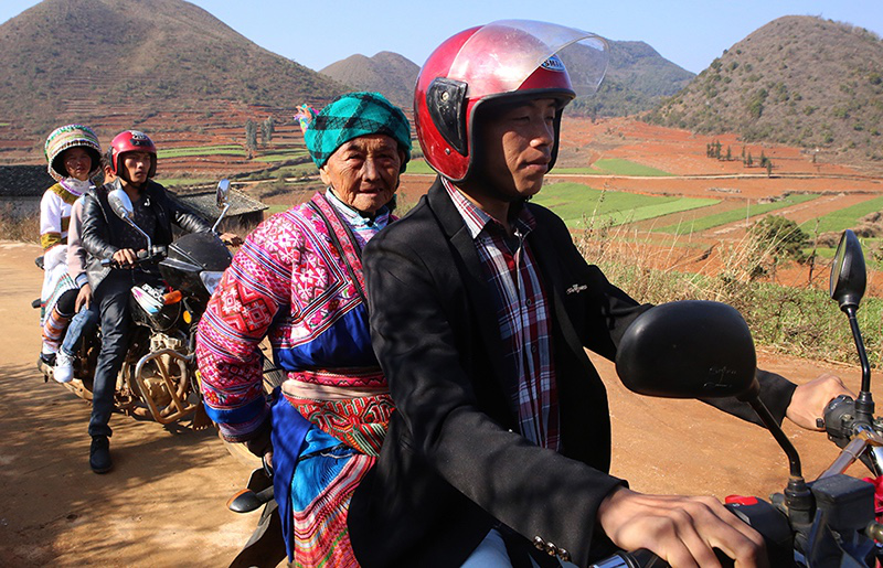 依布底一起去踩花山的人組成長長的摩托車隊(duì),老阿婆腰桿筆挺盛裝坐在摩托車后座上。等他們來到大布紅村的花山場(chǎng)時(shí),那里早已人山人海,空地上山坡上也擠滿了衣著鮮艷的人群。