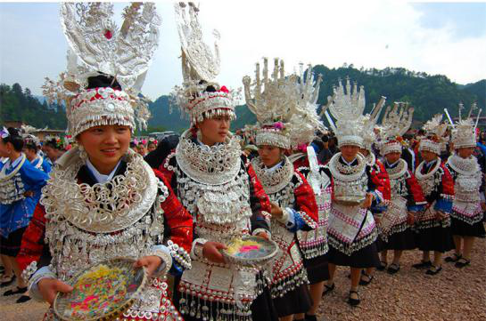 銀飾作為苗族最喜愛的傳統(tǒng)飾物,主要用于婦女的裝飾,品種多樣,分為頭飾、面飾、頸飾、肩飾、胸飾、腰飾、臂飾、腳飾、手飾等,彼此配合,體現(xiàn)出完美的整體裝飾效果。苗族銀飾常出現(xiàn)于苗族的喜慶場合,蘊涵有避邪趨正、納福迎祥的寓意,具體生動地反映著苗族人民的生存狀況、精神面貌和審美心理,具有很高的歷史文化研究價值。在對外交往中,苗族人民把銀飾作為禮品贈送友人,和藏族的哈達(dá)、漢族的珠寶一樣珍貴。