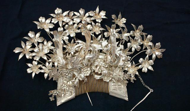 苗族銀飾鍛制技藝歷史悠久,先后經(jīng)歷了從原始裝飾品到巖石貝殼裝飾品、從植物花卉飾品到金銀飾品的演進歷程,傳承延續(xù)下來,才有了模式和形態(tài)基本定型的銀飾,其品種式樣至今還在不斷地翻新,由此形成的飾品鏈條成為苗族社會演進的象征之一。貴州省雷山縣、黃平縣、劍河縣、臺江縣和湖南省鳳凰縣五個地區(qū)的苗族銀飾鍛制技藝已入選國家級非物質(zhì)文化遺產(chǎn)名錄。