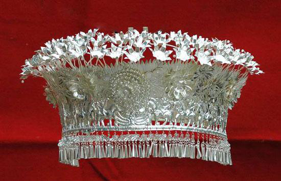 銀鳳冠和銀花帽是頭飾中的主要飾品,也是整套銀飾系列之首,素有龍頭鳳尾之美稱,其制作較為復(fù)雜,使用的小件飾品少則一百五十余件,多則達(dá)兩百余件,價值昂貴。苗族銀飾,如同苗族刺繡、織錦、蠟染等裝飾物一樣,是苗族支系相互區(qū)別的重要表征,不同地域的銀飾有著不同的特征。