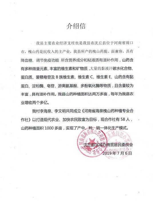 因?yàn)椤盎比龑殹钡男б婷黠@,合作社于2013年成立之初吸納社員102戶,種植面積達(dá)1000多畝。2014年5月,“槐三寶”商標(biāo)順利通過國(guó)家農(nóng)業(yè)部無公害農(nóng)產(chǎn)品認(rèn)證和無公害農(nóng)產(chǎn)品標(biāo)識(shí)使用權(quán),基地獲河南省農(nóng)業(yè)廳無公害農(nóng)產(chǎn)品產(chǎn)地認(rèn)定。發(fā)展到現(xiàn)目前,2019年,其種植面積已經(jīng)超過4000畝,產(chǎn)量在5500噸以上。據(jù)合作社監(jiān)事李文明講:“今年沒澇,現(xiàn)在七月,山藥快成熟了,可以預(yù)見,是個(gè)豐收年。”