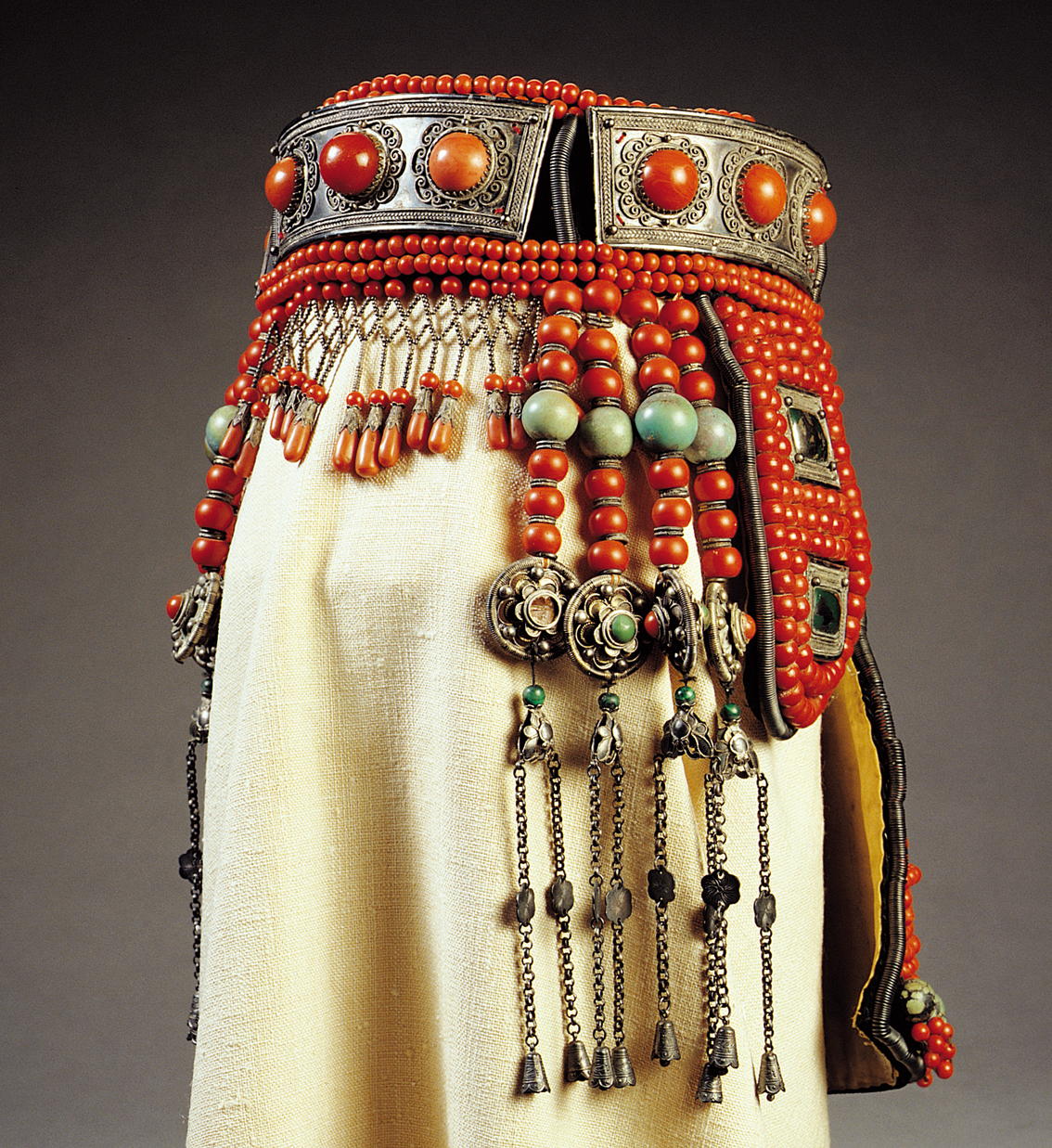 蒙古民族服飾主要包括首飾、袍子、腰帶、靴子四個(gè)部分。首飾大致可分為頭飾、項(xiàng)飾、胸飾、腰飾、手飾等五大類。頭飾主要有頭冠、頭戴、頭巾、頭圈、辮鉗、辮套、頭釵、頭簪、耳環(huán)、耳墜等,成為蒙古民族首飾中最絢麗的部分。