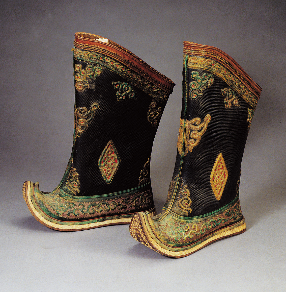 【圖為蒙古族民國時(shí)期貼花納底翹尖牛皮男靴,中央民族大學(xué)民族博物館館藏】