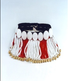 民族文化宮博物館收藏的這件傈僳族綴彩珠女子“歐勒”帽,于上世紀(jì)70年代征集于云南省怒江地區(qū)。整個頭飾直徑16厘米、重534克,質(zhì)地為琉璃質(zhì)、銅質(zhì)和海貝。帽身墜有24條紅珠、38條白珠,珠體直徑約0.5厘米,紅白珠串相間分布,每組珠串下墜有金色銅鈴,共29個,環(huán)繞整個帽身排列縫綴16個直徑約3厘米左右的白色海貝片。整個“歐勒”帽色彩鮮艷,制作精美,佩戴起來襯托得傈僳族女子光鮮亮麗、風(fēng)姿綽約。