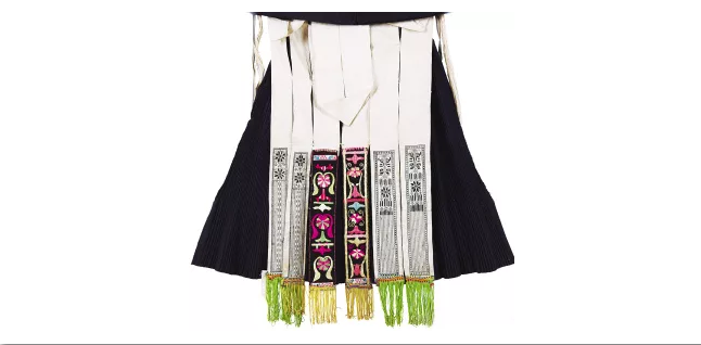 與北方少數(shù)民族圍腰的簡練大氣相比,南方少數(shù)民族的圍腰則更顯秀美精細,且常常佩戴前后兩塊圍腰。貴州開陽地區(qū)苗族女子的盛裝造型,就包含了層疊式前圍腰和飄帶式后圍腰:前圍腰分為5層,每層皆以數(shù)紗繡為主要裝飾工藝,結(jié)合絳子邊與金屬裝飾線,并用棉布進行包邊處理,圍腰面積較大且重量較沉,穿著時系在上衣與坎肩之外,上端兩角自然下翻。后圍腰以本白色棉布為料,分為6條飄帶,裝飾部位集中于飄帶下方,其中左右兩對飾有數(shù)紗繡,中間一對則為黑地彩色平繡,飄帶底部還縫綴彩色流蘇,頗具動感。細致的手工裝點出苗家女子之貌美,也彰顯著苗家女子之手巧。
