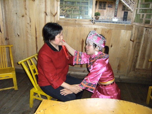 哭嫁歌內(nèi)容有“母女對(duì)哭”“嫂妹對(duì)哭”“姐妹對(duì)哭”“哭離娘席”“哭別祖宗”“哭兄弟”“哭梳頭”“罵媒人”“哭上轎”等,甚至還有同村同齡未婚姑娘的群哭——“哭十姊妹”??藜薷柙从谕良易骞媚锍黾耷暗目藜拗?,越是臨近婚期,哭聲越悲,甚至通宵達(dá)旦。2010年,“土家族哭嫁歌”已被列入第三批國家級(jí)非物質(zhì)文化遺產(chǎn)名錄。