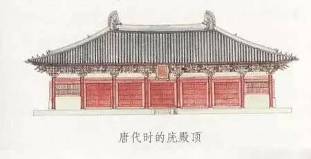 根據(jù)資料與記載,廡殿頂屋頂早在殷商時(shí)代就已出現(xiàn)。不過,現(xiàn)在對唐代中期以前的廡殿式屋頂?shù)木唧w結(jié)構(gòu)已無從得知,晚唐以后漸有實(shí)例可查。其形象是屋面平緩,正脊較短。正脊兩端為鴟尾而不是鴟首。