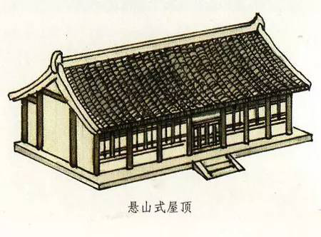 懸山式屋頂與硬山式屋頂一樣有一條正脊和四條垂脊。不過,它又有不同于硬山式屋頂那樣與山墻平齊,而是伸出山墻之外。這部分伸出山墻之外的屋頂是由下面伸出的桁(檁)承托的。所以懸山式屋頂不僅有前后出檐,在兩側(cè)山墻上也有出檐。懸山式是兩面坡屋頂?shù)脑缙谧龇ǎ贿^中國古代的重要建筑基本沒有使用懸山式屋頂?shù)?,特別是唐代以前尤為少見。