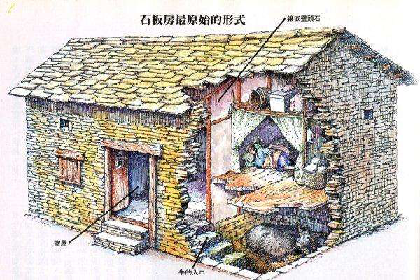 石板房以石條或石塊砌墻,墻可壘至5至6米高;以石板蓋頂,風(fēng)雨不透。總之,除檁條、椽子是木料外,其余全是石料,甚至家用的桌、凳、灶、缽都是石頭鑿的。一切都樸實(shí)無華,固若金湯。這種房屋冬暖夏涼,防潮放火,相對采光較差。