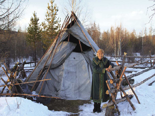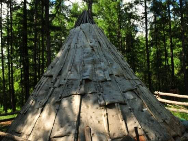 撮羅子的選址,是在地勢較高、陽光能照射到而且水和柴草就近可取的平坦之處。其蓋造方法,是用三五根約碗口粗細(xì)上有枝杈的木桿,相互交合搭成上聚下開的骨架,然后再用30根左右木桿搭在骨架之間捆綁固定,在南面(或東面)留出門,即基本成型。木桿搭起的只是“屋架”,外面還要覆蓋才能遮風(fēng)擋雨。按照季節(jié)的不同,分別用樺樹皮、草簾子和犴、狍等獸皮,做成自上而下一層壓一層的圍子,綁在木桿上,門簾則夏用草或樹條編,冬用狍皮做成。