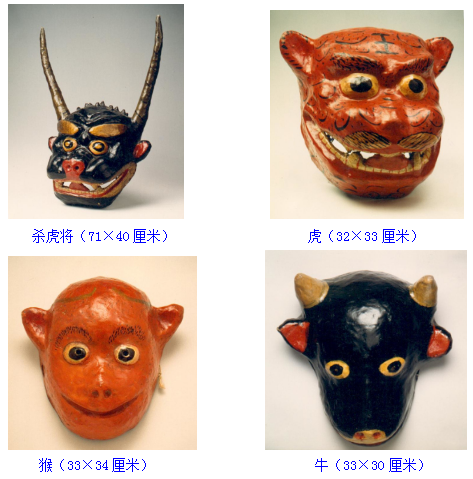 面具,土族語稱“面古子”,是土族在表演某些儀式舞蹈時(shí)用以表現(xiàn)一定內(nèi)涵的道具。按形制可分為假面和假頭兩大類。其中最具代表性的當(dāng)屬“納頓”節(jié)日當(dāng)中使用的面具。民族文化宮博物館珍藏了三組土族“納頓”面具,分別為表演“莊稼其”時(shí)的公公、婆婆、兒子、媳婦的假面面具;表演“殺虎將”時(shí)的殺虎將、虎、猴、牛的假面、假頭面具;表演三國演義人物關(guān)羽、張飛、曹操、呂布的假面面具。面具材質(zhì)均為布胎, 20世紀(jì)80年代征集于青海省海東市民和回族土族自治縣。