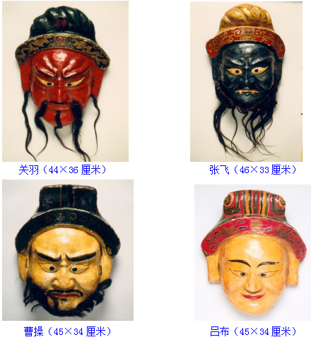 反映三國內(nèi)容的舞蹈有“五官”“三將”“五將”“關(guān)老爺”等內(nèi)容。面具角色有劉備、關(guān)羽、張飛、曹操、呂布等。表演動(dòng)作疾緩有序,再現(xiàn)了三國時(shí)驍將馳騁疆場(chǎng)的場(chǎng)面。
