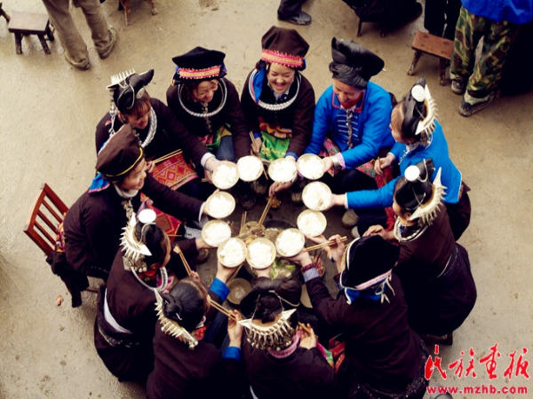 第二天是新娘出嫁的日子。早上七點,新娘的姑嫂和姐妹就早早地來到新娘家為新娘梳妝打扮,有的給新娘梳頭,有的給新娘穿衣,有的給新娘佩帶銀飾,女孩子們唧唧喳喳一陣熱鬧。經(jīng)過一個多小時的梳妝打扮,新娘就要出門了。