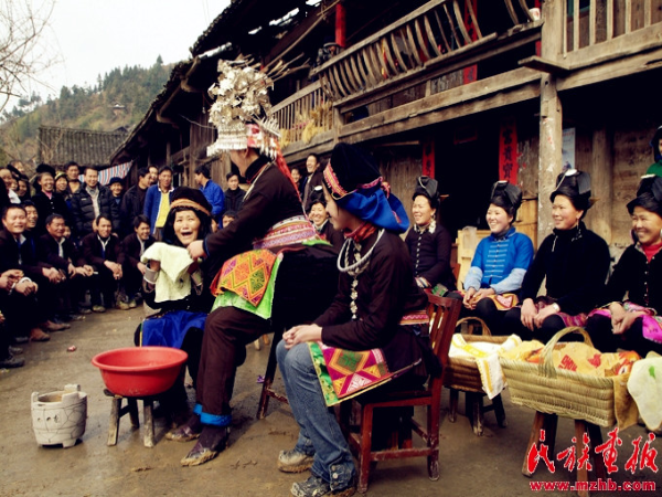 敬酒過后,新娘走上吊腳樓進入洞房休息片刻,然后與新郎一同在樓上向前來賀喜的親友拋灑喜糖。來賓蜂擁而上爭搶喜糖,一片歡騰場面。分完喜糖,新娘來到吊腳樓前的院子里用早已準(zhǔn)備好的清水親手為婆婆擦臉,表示新媳婦對長輩的尊敬與孝心。