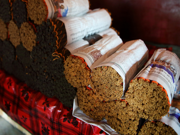 當(dāng)?shù)厝私榻B說:制作藏香的原材料和制作工序要求極其苛刻。由于藏香最主要的用途是用在宗教禮儀上,所以在制作過程中要求一切都要以圣潔為主,否則會被視為是對神靈的不敬。傳統(tǒng)的藏香原材料繁多而復(fù)雜,一般是柏樹樹干為主料,再以藏紅花、麝香、白檀香、紅檀香、紫檀香、沉香、豆蔻、穿山甲、甘菘、冰片、沒藥等幾十種香料按適當(dāng)比例配合主料搓揉而成。據(jù)了解,用于制作藏香的主料柏樹干,在吞巴村這樣高海拔的地方并不生長,從古至今,村民都要從400多公里外的林芝縣運過來了,而制作藏香的部分輔料甚至要從印度引進(jìn)。