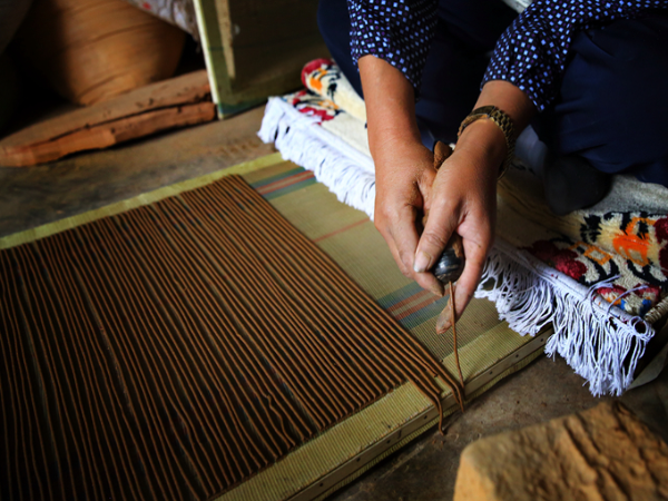 制作藏香的師傅以手工在專用的制香器具上將糊狀備料制作成條狀