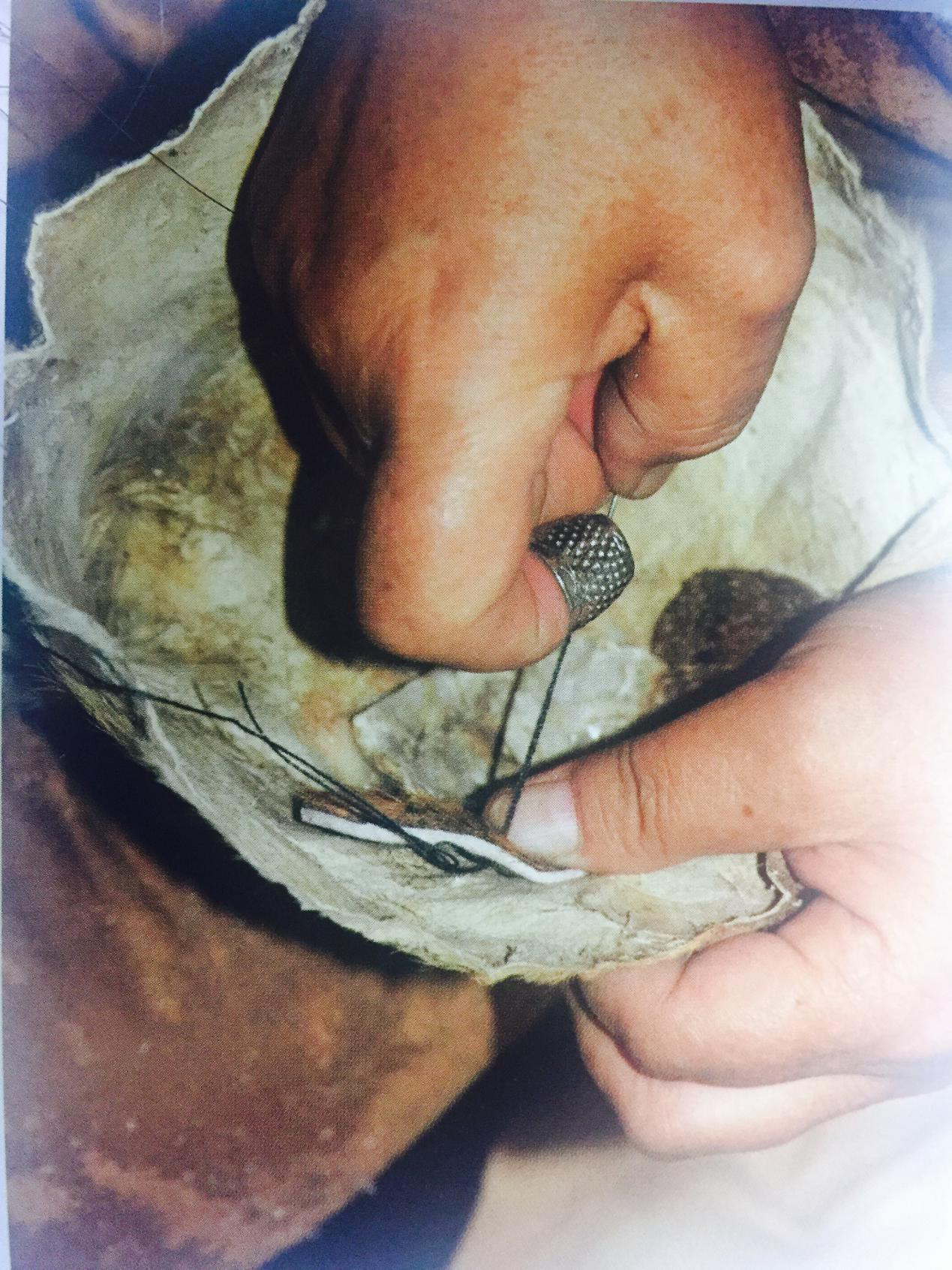 狍角帽是用整狍子的頭顱,去掉骨肉后,保留狍頭上的毛、角、耳朵、鼻子和口,精心鞣制而成。主要制作流程是:剝皮,清洗、熟皮,定型,補(bǔ)眼睛、刺繡、制作繡片,縫合護(hù)耳與頭皮,制作里襯。制作時(shí),如何剝得完整的頭皮,是整個(gè)制作環(huán)節(jié)的關(guān)鍵。