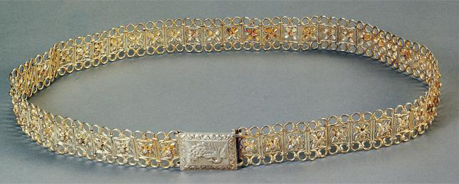 傣族銀腰帶傣族婦女喜歡帶手鐲、戒指、耳墜、項(xiàng)鏈等,這些物飾金質(zhì)、銀質(zhì)、玉石均可,仿制品也行。女嬰生下來幾天,就由家長用消過毒的針為娃娃扎耳,為帶耳環(huán)作準(zhǔn)備。對女性而言,銀腰帶更是不可缺少之物,腰帶上飾以孔雀、蓮花等各種花型。女人們認(rèn)為銀腰帶越寬就越美(圖為傣族銀腰帶,以上圖片為中央民族大學(xué)博物館館藏)。