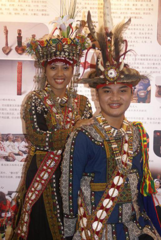 高山族過(guò)去以裸身為美,裸形赤足,僅以獸皮、樹皮及植物纖維制作的幅布蔽體,有鑿齒、穿耳的習(xí)俗。接觸漢文化后,逐步形成了男著長(zhǎng)衫、女著裙裝的習(xí)慣,衣服除了獸皮和樹皮外,還喜好用自織麻布,飾以彩色紋樣。