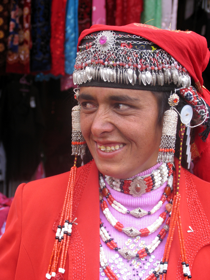 塔吉克族婦女服飾的顏色艷麗而奪目,大多數(shù)會(huì)以紅色為主,她們喜歡穿連衣裙,并在裙邊、領(lǐng)口、袖口上繡以美麗的花紋或者圖案,還喜歡用耳環(huán)、項(xiàng)鏈、手鐲等首飾來(lái)裝扮自己。她們十分講究頭飾和帽子,有一種青年婦女的圓形花帽上會(huì)嵌鑲金、銀片和各種珠子,帽子前沿會(huì)裝飾一排色彩鮮麗的珠子、銀鏈。婦女著裝時(shí)帽沿上會(huì)加綴一排小銀鏈,在塔吉克語(yǔ)中稱為“斯拉斯拉”,戴著大耳環(huán),脖子山會(huì)繞數(shù)道項(xiàng)鏈,胸前還會(huì)佩戴被稱為“阿勒卡”的圓形大頭飾。通常情況下,已婚婦女會(huì)在發(fā)辮上綴飾白紐扣,新娘也會(huì)在發(fā)辮上飾以絲穗,以求美觀。在塔什庫(kù)爾干,打扮得花枝招展的塔吉克婦女隨處可見(jiàn),猶如從天上云彩中下凡的仙女。塔吉克族已婚婦女的裝束也十分吸人眼球,她們外出時(shí),會(huì)在帽子外披上頭巾,迎風(fēng)走來(lái),頭巾隨風(fēng)飄揚(yáng),別有一番風(fēng)度。