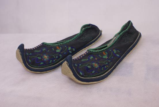 壯族花鞋是壯族的刺繡工藝之一,又稱“繡鞋”,為婦女所用,流行于廣西龍州等地。鞋頭有鉤,象龍船。分有后跟和無后跟兩種。鞋底較厚。針法有齊針、拖針、混針、盤針、堆繡、壓繡等。在色彩上,年輕人喜用亮底起白花,常用石榴紅、深紅、青黃、綠等艷麗色,紋樣有龍鳳、雙獅滾球、蝶花、雀等;老年人多用黑色、淺紅、深紅等厚色,紋樣有云、龍、天地、獅獸等。