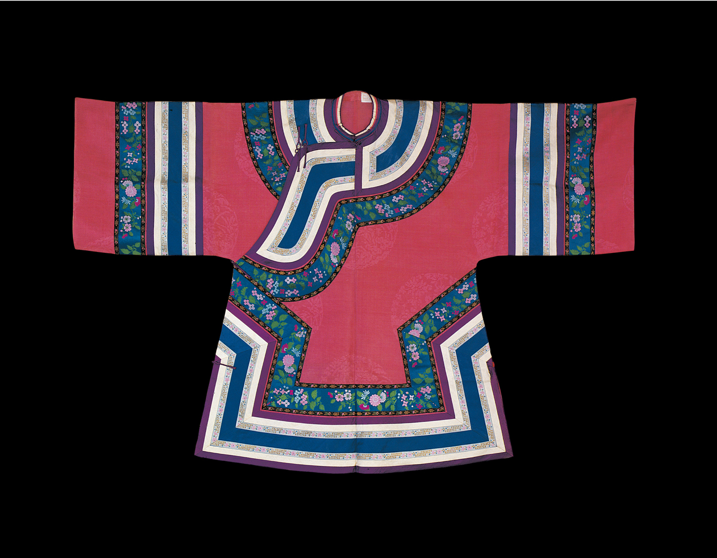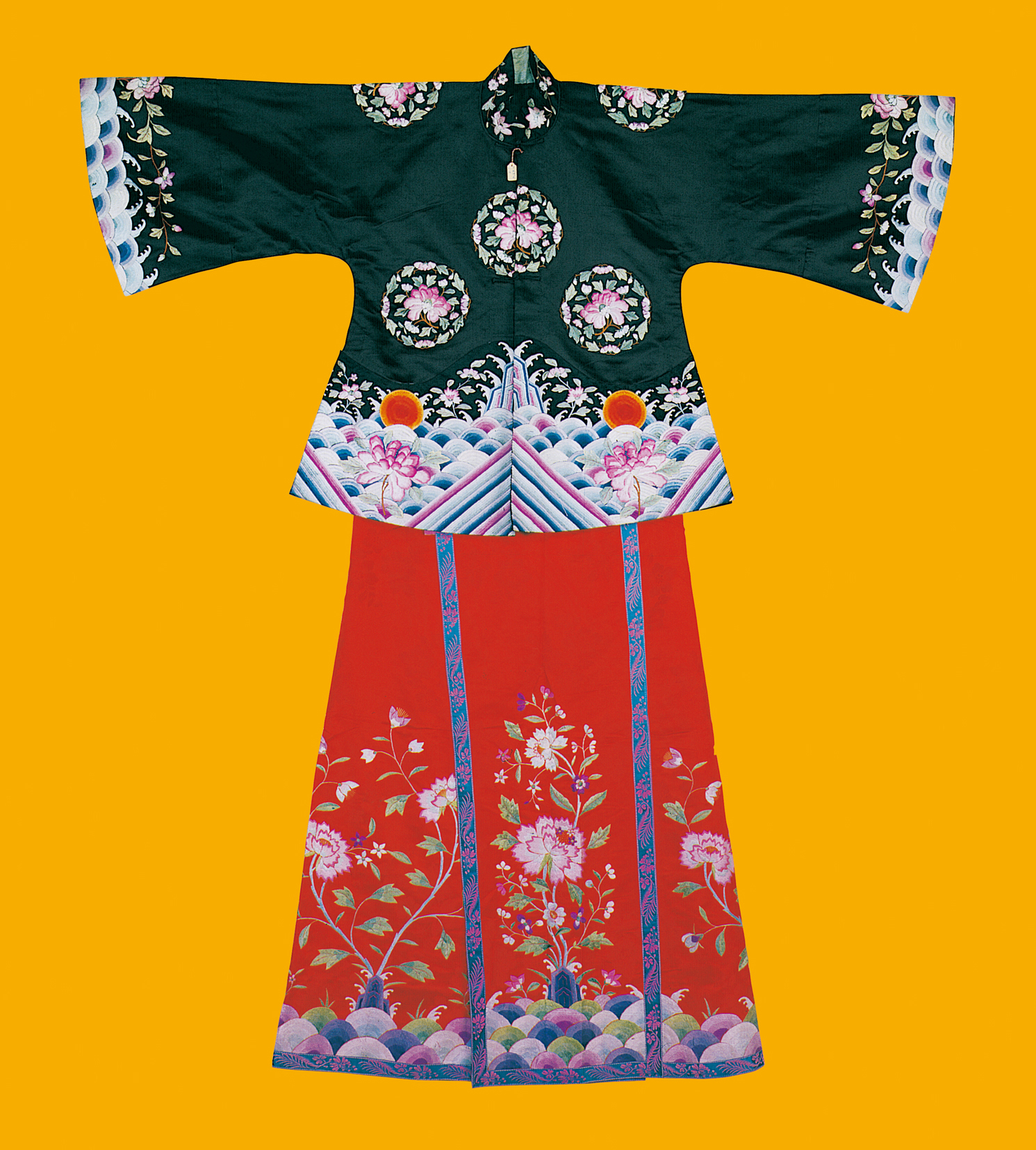 元代,作為民族大融合和中外文化大交流時(shí)期,長(zhǎng)衣統(tǒng)稱為袍,其樣式南北方差異不大,但材料貴賤精粗,卻差距懸殊。漢族男性發(fā)式變化不多,但北方的漢族女性發(fā)式較前簡(jiǎn)化。在元朝并沒(méi)有完整的冠服制度。蒙古人入主中原后仍保持其生活習(xí)俗,但同時(shí)又受漢族的影響,服飾日趨華麗。在大宴活動(dòng)中,天子百官要穿統(tǒng)一顏色的服裝,稱為“質(zhì)孫服”,其形為袍襖狀,與漢族深衣相近(圖為漢族清代牡丹紋緞繡女裝,中央民族大學(xué)民族博物館館藏)。