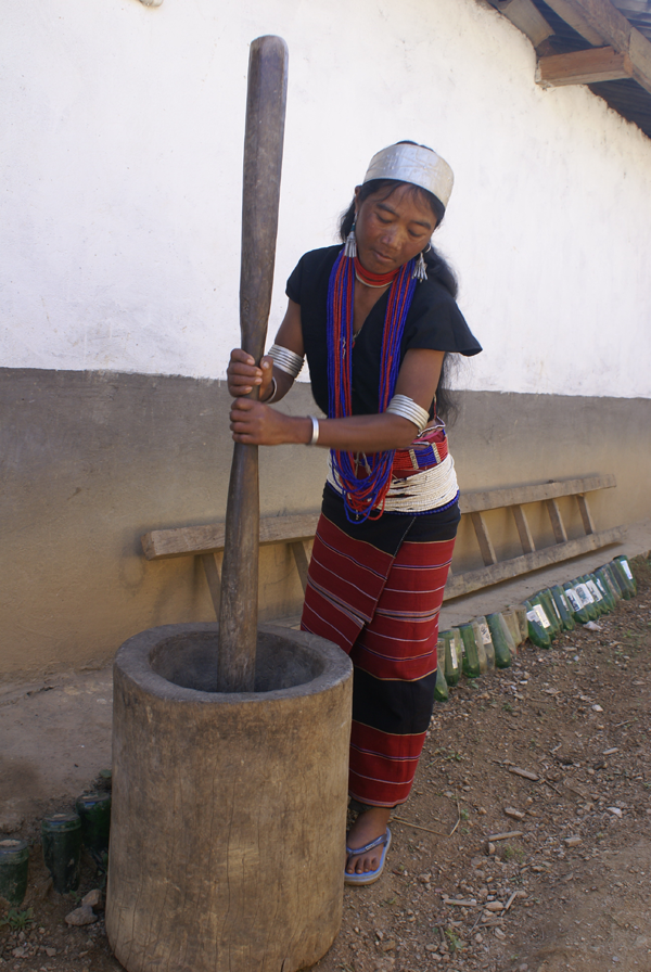 佤族以大米為主食。西盟地區(qū)的佤族都喜歡把菜、鹽、米一鍋煮成較稠的爛飯。其他地區(qū)的佤族則多吃干飯。農(nóng)忙時(shí)日食三餐,平時(shí)吃二餐。雞肉粥如茶花稀飯是家常食品的上品。旱稻多現(xiàn)吃現(xiàn)舂,男女老幼皆食辣椒,民間有“無(wú)辣子吃不飽”之說(shuō)。副食是青菜類、瓜類、酸竹筍、鹽、辣椒、蔥、蒜等。肉食主要是牛、豬、雞、狗以及獵獲的獸、禽、松鼠、田鼠、魚(yú)、螺螄、螃蟹、蜂兒等。一些地區(qū)的佤族還有捕食昆蟲(chóng)的習(xí)慣,更食用蛹、寄生于草木植物的紅毛蟲(chóng)、掃把蟲(chóng)和寄生于冬瓜樹(shù)的冬瓜蟲(chóng)等十余種。一般是把可食的昆蟲(chóng)與米一起煮成粥,加菜、鹽、拌辣椒,香辣可口(兩圖為舂米和舂米用具,劉軍攝影)。