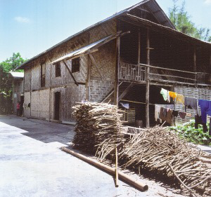 云南瑞麗的傣族民居。瑞麗的傣族民居是二層的竹樓,竹編外墻是利用竹皮正反面的紋理和光滑粗糙面編織的,從檐下垂直到底,均勻的縫隙透光通風,在強光照射下,其多變的幾何圖案更突出了工藝技巧和干欄式建筑的整體美感。屋面脊長,出檐短,大都用鍍鋅瓦楞鐵板替代草頂。樓層四壁以竹篾板封閉,開尺許小窗。外附短柱作下層重檐的斜撐,四周再加一圈矮柱,與墻面斜撐配。