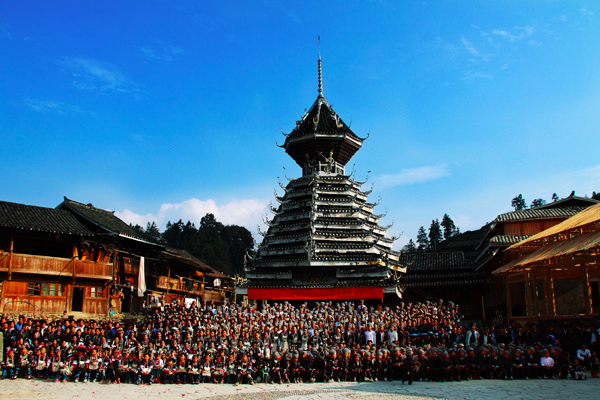 每年的農(nóng)歷八月十五中秋節(jié),小黃都會(huì)舉行賽歌會(huì),有幾十上百人唱歌的壯觀場(chǎng)面,是觀賞侗歌的最佳時(shí)機(jī)。侗族的大歌表演常在鼓樓舉行。侗族的鼓樓、風(fēng)雨橋和大歌是侗族原生文化最突出的標(biāo)志,被稱作“侗寨三寶”。鼓樓是侗族村寨的標(biāo)志性建筑,形似巨大的杉樹,村民稱之為“遮蔭樹”。在沒有鼓樓的年代,人們的許多活動(dòng)是在古杉樹下進(jìn)行的。后來,為了滿足社會(huì)和文化活動(dòng)的需要,修建固定建筑物時(shí)便以杉樹為原型。文獻(xiàn)資料稱:“侗人居溪峒中,春以巨木埋地作樓,高數(shù)丈,歌者夜則緣宿其上?!边@就是最初的“鼓樓”。