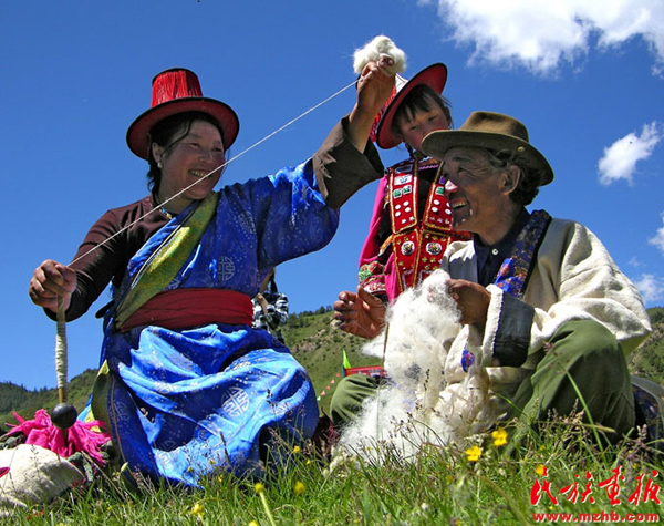 在放牧?xí)r裕固人常常捻羊毛。 央金 攝影 引自民族畫(huà)報(bào)