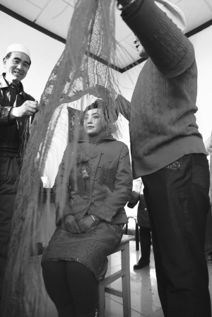 新娘出發(fā)前,在頭上蒙上一塊紅紗